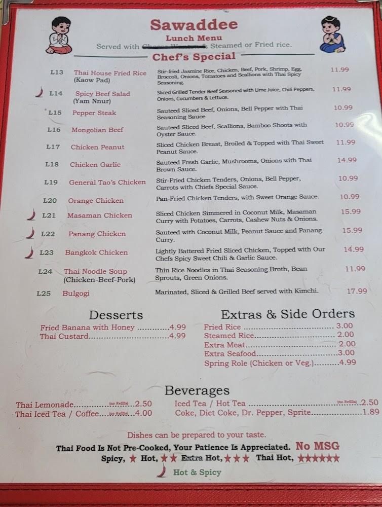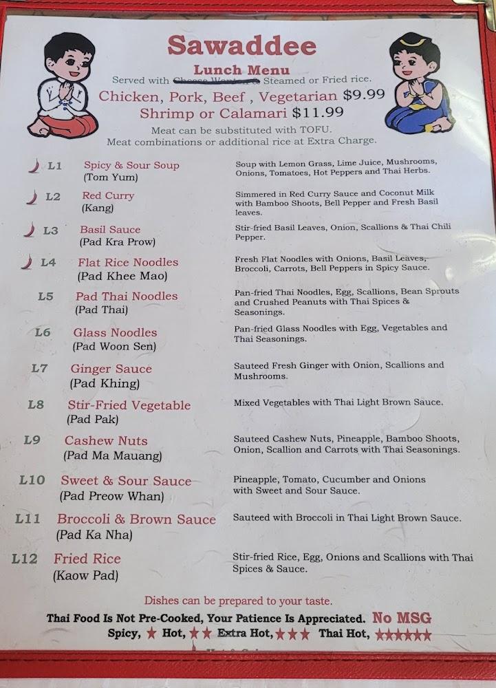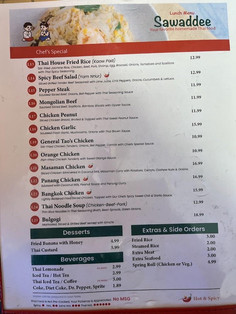 The menu at Sawaddee celebrates Thai cuisine's rich diversity. With over 60 items, there's something for everyone. Signature dishes like Chicken Pad Thai and Panang Curry are favorites. Components range from vegan-friendly options to meat-based meals. Each dish reflects traditional Thai cooking methods, emphasizing fresh ingredients.