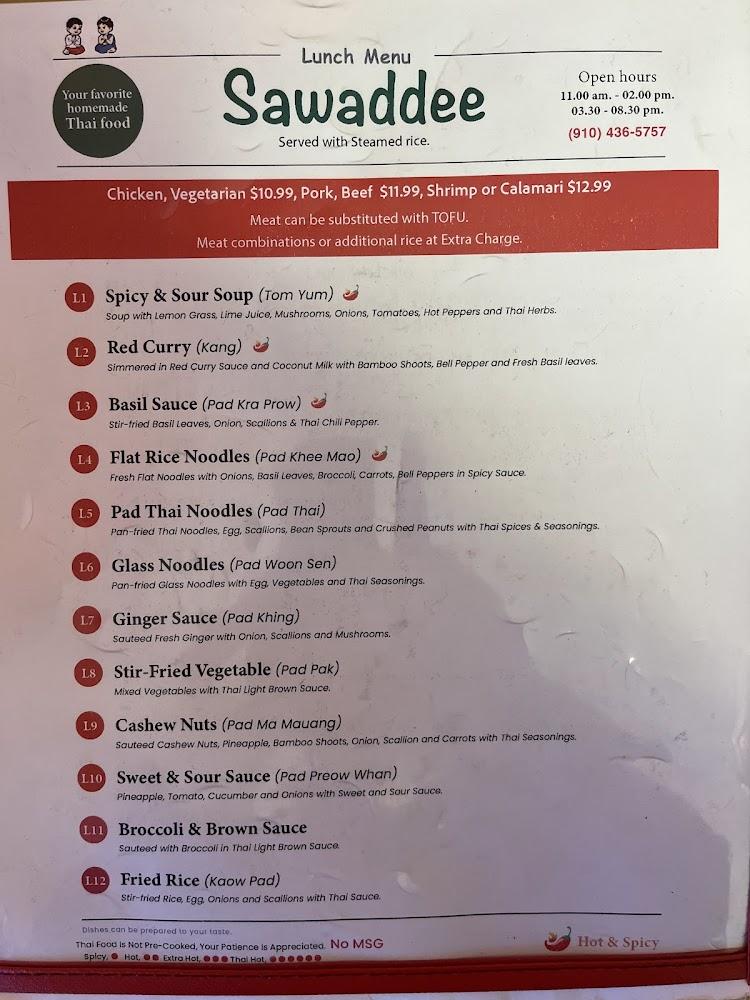 Welcome to Sawaddee, your go-to Thai restaurant located at 1006 N Bragg Blvd, Spring Lake, NC. Offering a delightful range of traditional dishes, from spicy Pad Thai to savory spring rolls, there’s something for everyone in a warm and relaxed atmosphere. Enjoy our extensive selection of teas or opt for our healthy vegetarian and vegan options. Whether you dine in or take out, we ensure a convenient experience with accessible seating and facilities. Perfect for lunch, dinner, or solo meals, Sawaddee is dedicated to serving you authentic flavors at an affordable price. Join us for a delicious culinary journey!